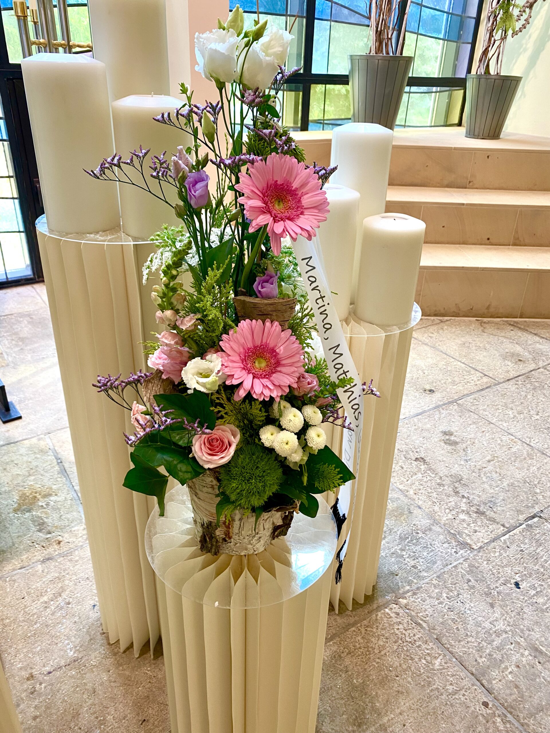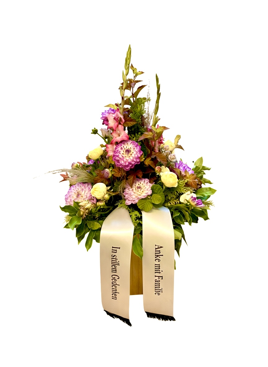 Auf Wunsch kann das Trauergesteck von Bock Blumen mit einer persönlich bedruckten Trauerschleife (z. B. mit Abschiedsgruß und Namen der Angehörigen) ergänzt werden.