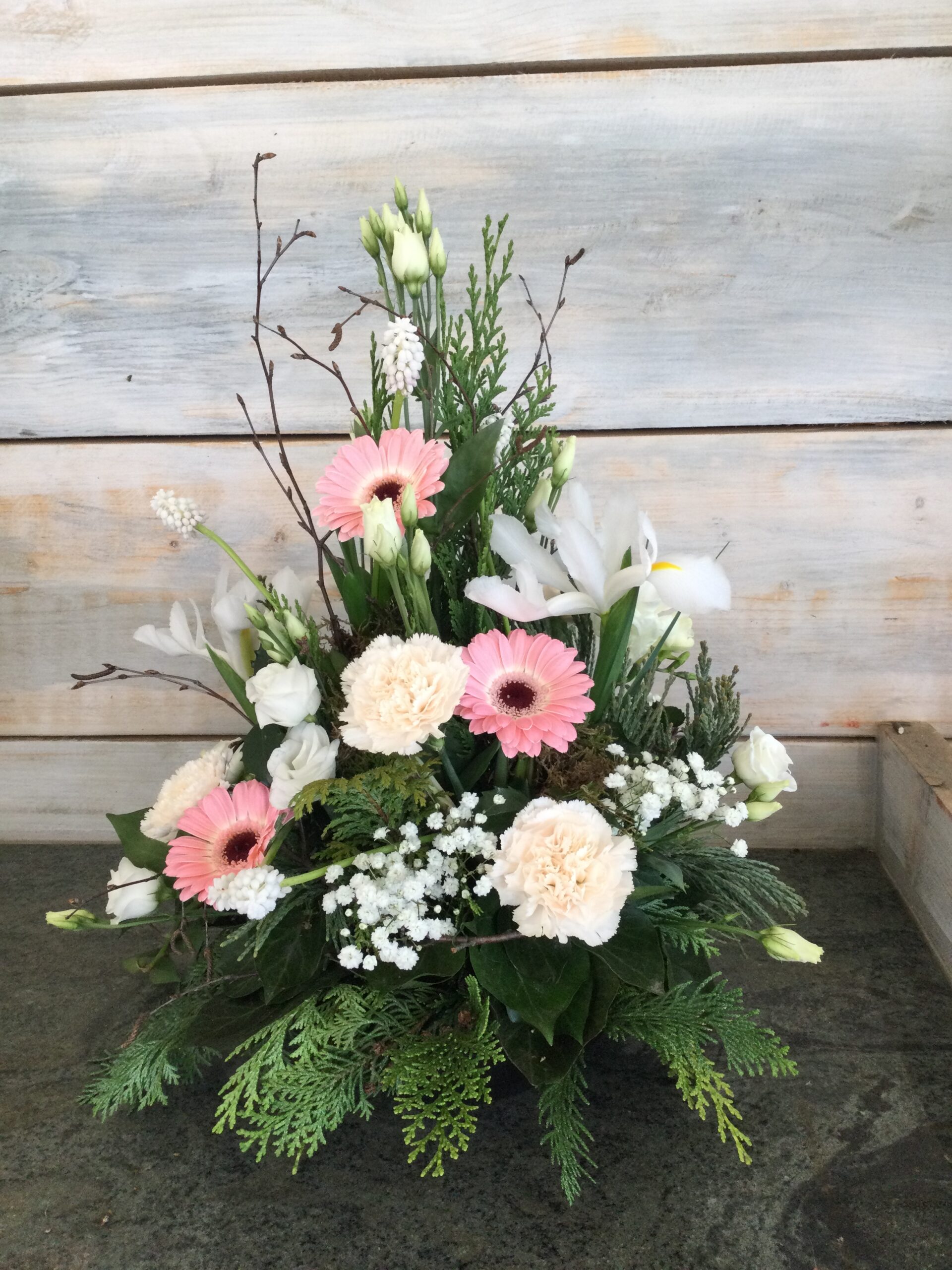 Fein abgestimmte weiße Nelken sowie frisches, hochwertiges Grün sorgen für einen harmonischen Rahmen und verleihen dem Trauergesteck eine natürliche, ruhige Ausstrahlung.