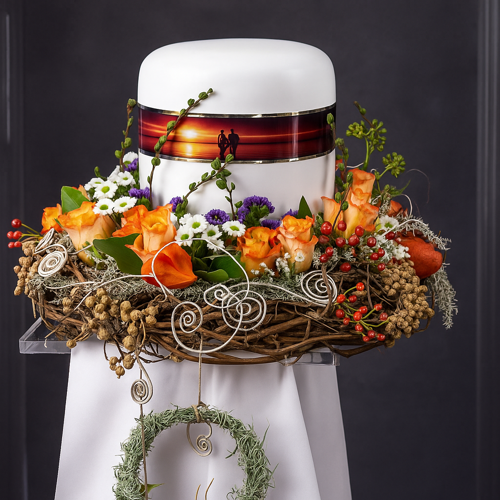 Dieses elegante Urnengesteck umrahmt die Urne mit einem blütenreichen Kranzschmuck am Fuß und schafft einen warmen, tröstlichen Akzent für die Trauerfeier. Die harmonische Kombination aus weißen und orangefarbenen Blüten wirkt natürlich und freundlich – sie mildert die Schlichtheit der Urne, ohne ihre Würde zu mindern.