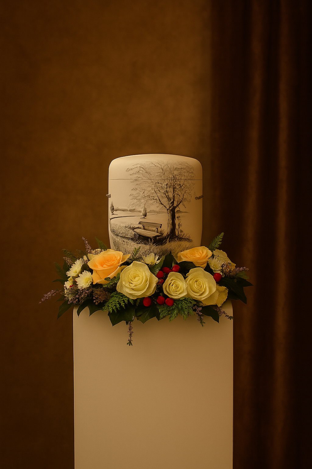 Dieses elegante Urnengesteck umrahmt die Urne mit einem blütenreichen Kranzschmuck am Fuß und schafft einen warmen, tröstlichen Akzent für die Trauerfeier. Die harmonische Kombination aus weißen Blüten wirkt natürlich und freundlich – sie mildert die Schlichtheit der Urne, ohne ihre Würde zu mindern.